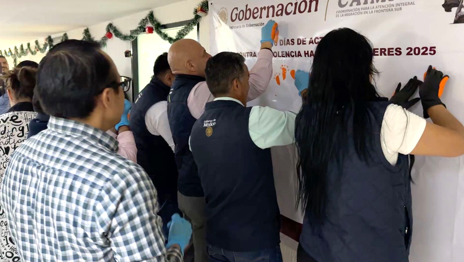 26-11-2025 Servidores públicos de la CAIMFS visibilizan a través de “Mural de huellas” la problemática de mujeres migrantes en la frontera sur de México.