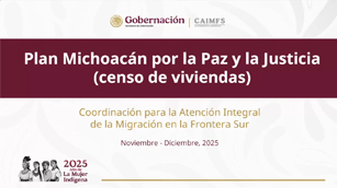 Para fortalecer el tejido social en Michoacán, el Gobierno de México llevará a cabo un “Censo Casa por Casa” en todo el estado de Michoacán. A la Secretaría de Gobernación le corresponde coordinar acciones en la región Apatzingán, que se integra de 8 municipios, donde los servidores públicos de la CAIMFS apoyan en las actividades. |