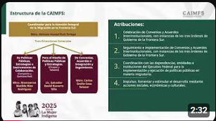 Video de las acciones realizadas por personal de la CAIMFS, entre las que destacaron: Apoyo al programa Construcción de Paz, en Ciudad Juárez, Chihuahua; seminario de Derechos de la Mujer; recorrido con el INAMI en la frontera sur, reuniones virtuales con municipios fronterizos, entre otras. |